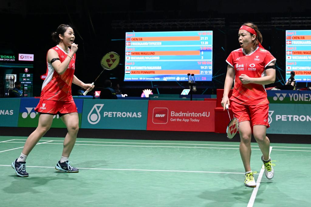 1月11日,陳清晨(右)/賈一凡在比賽中慶祝得分。新華社記者程一恒攝 中國(guó)隊(duì)五對(duì)女雙組合全部闖過(guò)首輪,第二輪在一場(chǎng)國(guó)羽隊(duì)內(nèi)較量中,李怡婧/羅徐敏以0:2不敵劉圣書(shū)/譚寧,遺憾止步十六強(qiáng)。另外三對(duì)組合陳清晨/賈一凡、張殊賢/鄭雨、李汶妹/劉玄炫分別戰(zhàn)勝丹麥組合弗勒爾戈德/蒂格森、美國(guó)組合許忻霏/許怡霏、泰國(guó)組合宗功攀/拉溫達(dá),進(jìn)入下一輪。