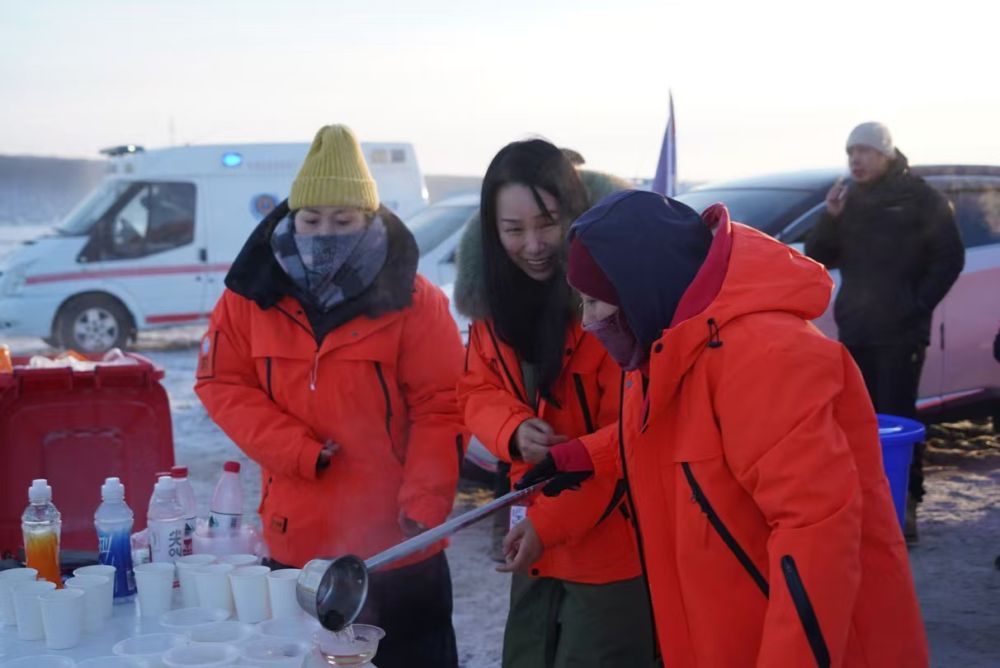 “加油!”“新年快樂(lè)!”參賽者、志愿者等互相加油鼓勁,在數(shù)九寒天中互送暖心祝福。