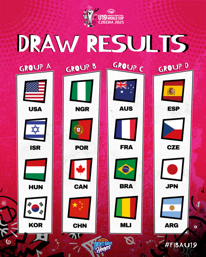 一共有16支來(lái)自世界各地的U19隊(duì)伍將參加7月12日至20日在捷克布爾諾舉行的U19女籃世界杯,這16支球隊(duì)被分為四個(gè)小組。A組包括美國(guó)隊(duì)、以色列隊(duì)、匈牙利隊(duì)和韓國(guó)隊(duì),C組是澳大利亞隊(duì)、法國(guó)隊(duì)、巴西隊(duì)和馬里隊(duì),D組是西班牙隊(duì)、捷克隊(duì)、日本隊(duì)和阿根廷隊(duì)。