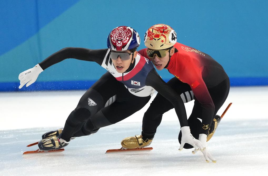 2月9日,中國隊選手林孝埈(右)、韓國隊選手樸智元在比賽中發(fā)生身體碰撞。新華社記者 顏麟蘊(yùn) 攝