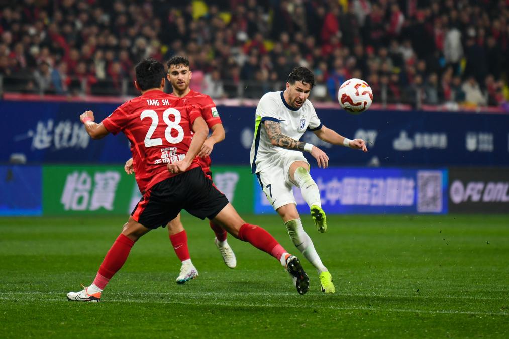 2月22日,武漢三鎮(zhèn)隊球員紹爾(右)在比賽中傳球。新華社記者胥冰潔攝
