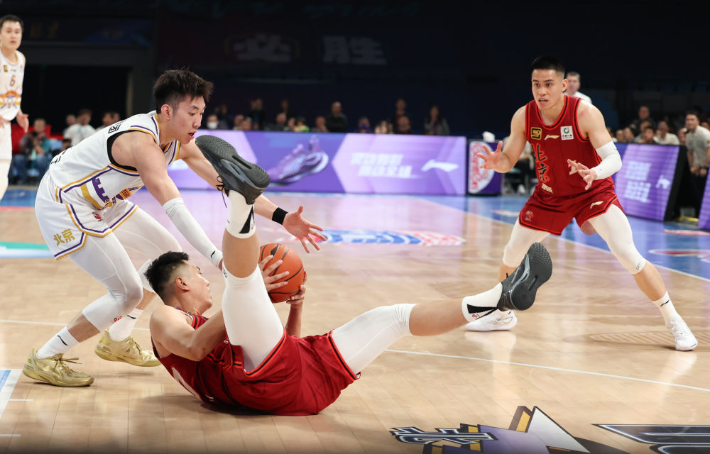 4月14日,北京隊球員翟曉川(中)在比賽中倒地拼搶。新華社記者 王楷焱 攝