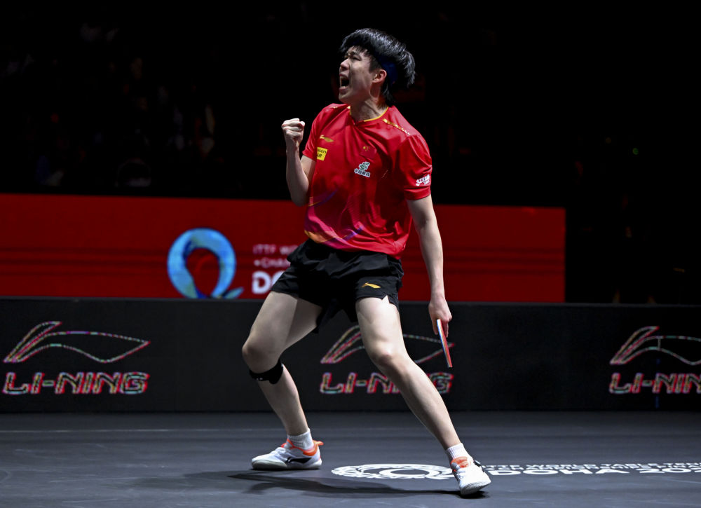 5月22日,王楚欽在比賽中慶祝得分。新華社記者 賀長山 攝