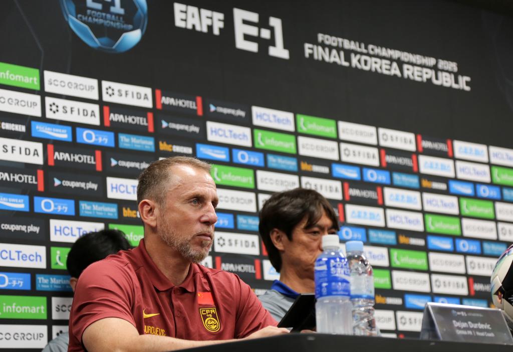 7月6日,久爾杰維奇(前)出席新聞發(fā)布會(huì)。新華社記者 黃昕欣 攝 2025年?yáng)|亞足聯(lián)E-1足球錦標(biāo)賽(東亞杯)將于7月7日至16日在韓國(guó)京畿道水原市及龍仁市舉行。6日,中國(guó)隊(duì)、韓國(guó)隊(duì)、日本隊(duì)、中國(guó)香港隊(duì)主教練及代表球員出席男足賽前新聞發(fā)布會(huì)。 久爾杰維奇在會(huì)上表示,面對(duì)日本隊(duì)、韓國(guó)隊(duì)這些亞洲頂級(jí)球隊(duì),東亞杯將為國(guó)足球員帶來(lái)很好的競(jìng)技環(huán)境?!斑@么強(qiáng)的對(duì)手能夠充分考驗(yàn)我們的球員,測(cè)試我們新團(tuán)體能力如何。” 中國(guó)足球協(xié)會(huì)6月27日宣布,久爾杰維奇擔(dān)任中國(guó)國(guó)家男子足球隊(duì)代理主教練,率隊(duì)參加2025年?yáng)|亞杯比賽。2023年3月,久爾杰維奇曾出任中國(guó)國(guó)家男子足球亞運(yùn)隊(duì)主教練;2024年1月,久爾杰維奇出任中國(guó)U19國(guó)家男子足球隊(duì)主教練。