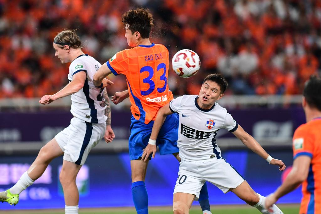 7月27日,山東泰山隊球員高準(zhǔn)翼(中)在比賽中爭頂。新華社記者 朱崢 攝