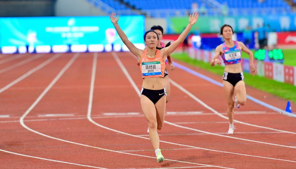 浙江隊(duì)選手陳妤頡(前)在第一屆全國(guó)青少年田徑運(yùn)動(dòng)會(huì)女子100米決賽沖線后慶祝。新華社記者 吳青昊 攝