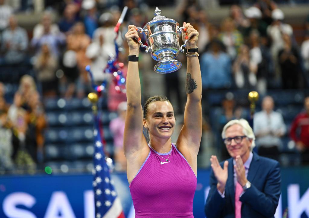 2024年9月7日,薩巴倫卡在頒獎(jiǎng)儀式上高舉獎(jiǎng)杯。當(dāng)日,在2024美國網(wǎng)球公開賽女子單打決賽中,白俄羅斯選手薩巴倫卡2比0戰(zhàn)勝美國選手佩古拉,獲得冠軍。新華社記者 李睿 攝