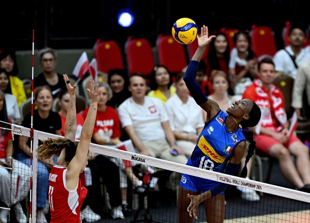 意大利隊埃格努(右)在比賽中扣球。新華社記者 侯昭康 攝 在3日晚的比賽中,世界排名第一的意大利隊以25:17、25:21和25:18戰(zhàn)勝了世界排名第三的波蘭隊,將其在國際賽事中的連勝記錄延續(xù)到34場。埃格努為意大利隊拿下了全場最高的20分。 為意大利隊貢獻12分的法爾說:“我們?yōu)檫@場比賽做了很多努力,從一開始就給對方施加壓力。我們的攔網(wǎng)和防守很成功,給對手制造了很大麻煩。我為我們的表現(xiàn)感到高興,對后面的半決賽充滿期待?!?/p> 為波蘭隊得到8分的主攻盧卡西克說,這支意大利隊非常強大,跟她們比賽非常困難。波蘭隊也在尋找意大利隊的漏洞,在比賽中努力向她們施加壓力,可是她們總能找到解決的辦法。