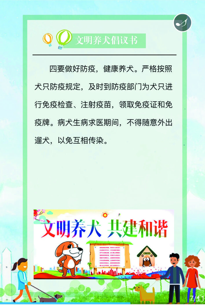 在宣傳活動(dòng)中,民警深入街道、小區(qū)、商鋪等人員密集場所,在宣傳欄懸掛文明養(yǎng)犬宣傳標(biāo)語、張貼文明養(yǎng)犬倡議書等宣傳資料,向轄區(qū)居民詳細(xì)講解《忻州市養(yǎng)犬管理?xiàng)l例》《文明養(yǎng)犬公告》的具體內(nèi)容,引導(dǎo)養(yǎng)犬群眾主動(dòng)辦理養(yǎng)犬登記證、出門為犬只佩戴犬牌、定期為犬只注射疫苗,做到依法養(yǎng)犬、文明養(yǎng)犬、衛(wèi)生養(yǎng)犬、健康養(yǎng)犬、安全養(yǎng)犬?;顒?dòng)中,該局共懸掛宣傳標(biāo)語50條,張貼文明養(yǎng)犬倡議書500份,向群眾發(fā)放宣傳資料3500人/份。