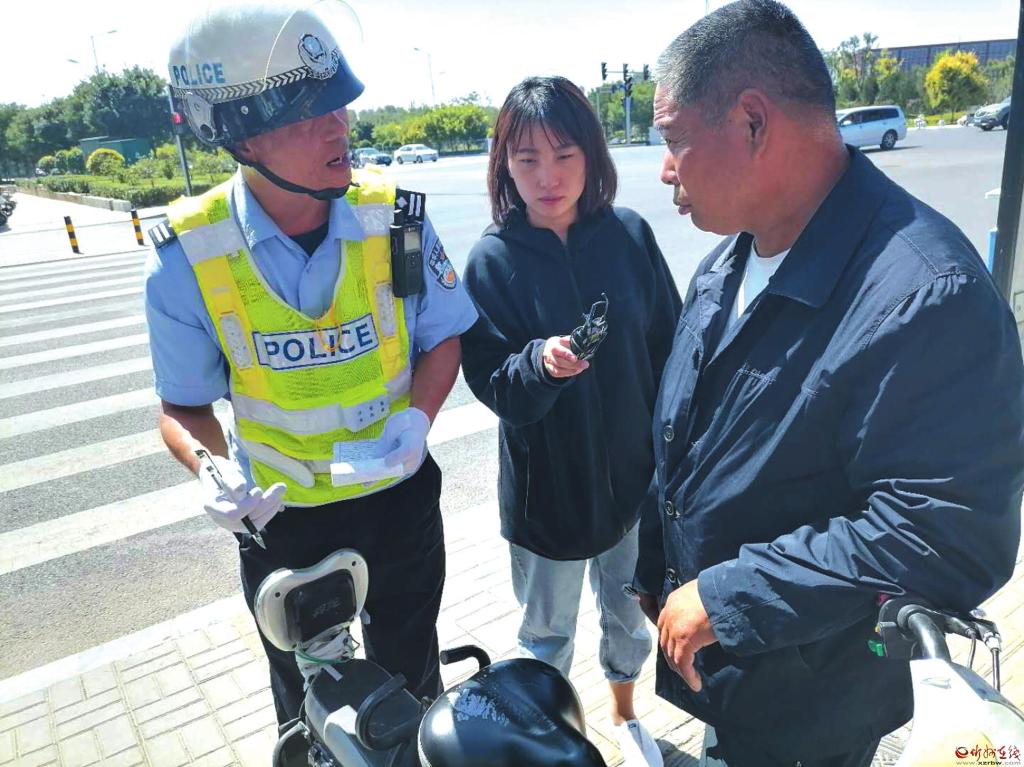 行人騎行電動(dòng)車闖紅燈接受教育。 張志遠(yuǎn) 攝