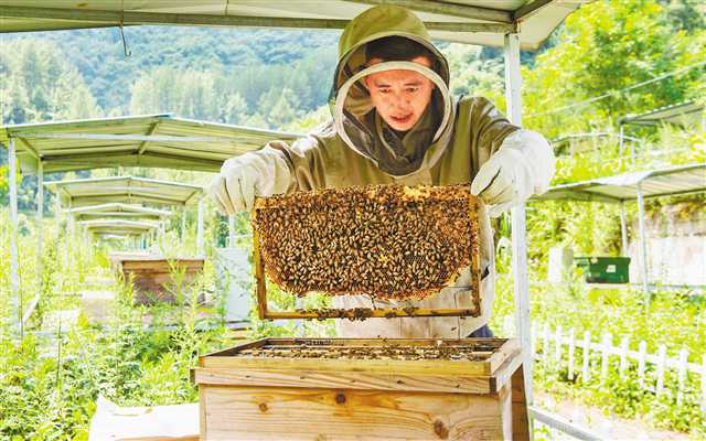 今年4月,重慶市石柱縣中益鄉(xiāng)鹽井村,蜜蜂的嗡鳴聲奏響了致富交響曲。自從中益鄉(xiāng)發(fā)展了電商平臺(tái),陳小平的蜂蜜生意越來越紅火?!傲碌捉桓读诉@500群蜂種,今年就能再增收25萬元。”鹽井村蜂農(nóng)陳小平說。2016年開始養(yǎng)蜂至今,陳小平的蜜蜂已經(jīng)從最初的30多群逐年擴(kuò)增至如今的300多群,2019年,2000斤的蜂蜜產(chǎn)量為他帶來20萬元的收入。 圍繞“中華蜜蜂第一鎮(zhèn)”主題定位,中益鄉(xiāng)推動(dòng)產(chǎn)業(yè)從“一產(chǎn)支撐”向農(nóng)旅融合發(fā)展深度調(diào)整,陸續(xù)修建休閑廣場(chǎng)、娛樂設(shè)施,發(fā)展“中益蜜蜂小鎮(zhèn)”電商平臺(tái),大力發(fā)展旅游業(yè)。