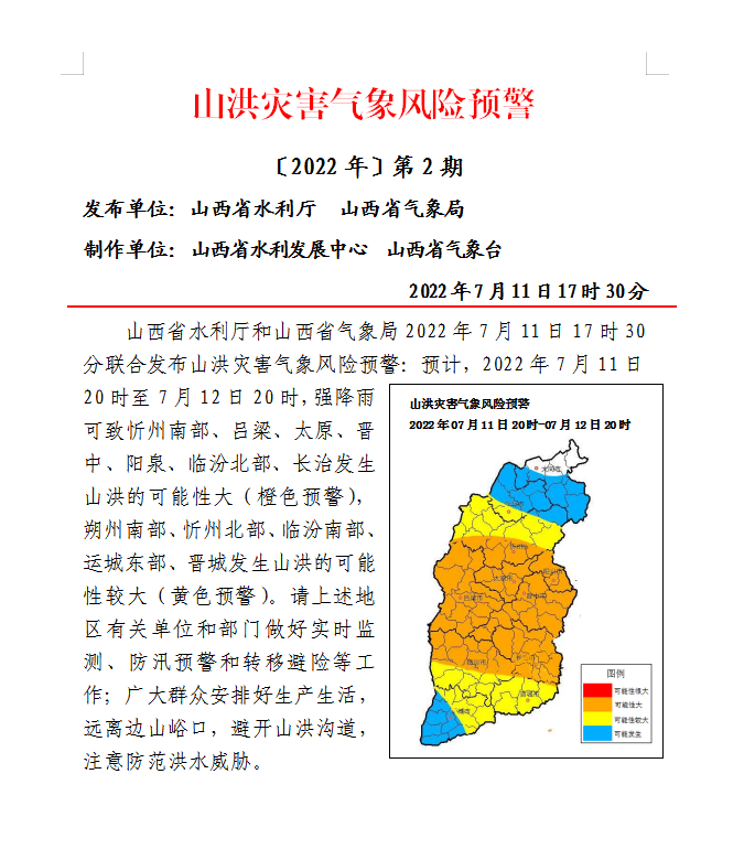 山西省水利廳和山西省氣象局2022年7月11日17時30分聯(lián)合發(fā)布山洪災(zāi)害氣象風(fēng)險預(yù)警:預(yù)計(jì),2022年7月11日20時至7月12日20時,強(qiáng)降雨可致忻州南部、呂梁、太原、晉中、陽泉、臨汾北部、長治發(fā)生山洪的可能性大(橙色預(yù)警),朔州南部、忻州北部、臨汾南部、運(yùn)城東部、晉城發(fā)生山洪的可能性較大(黃色預(yù)警)。