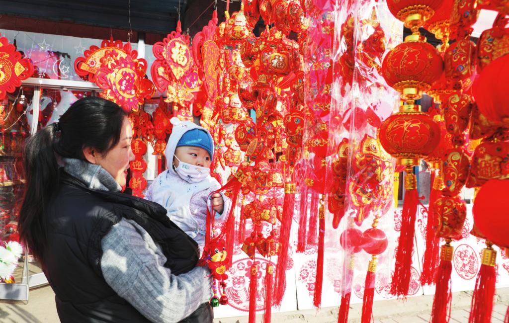 近日,在原平市小集鎮(zhèn)批發(fā)市場,人們紛紛選購大紅“?!弊?、紅燈籠、中國結、春聯、生肖虎元素的節(jié)日喜慶物品,紅紅火火迎接新春佳節(jié)。 (褚 震 攝)
