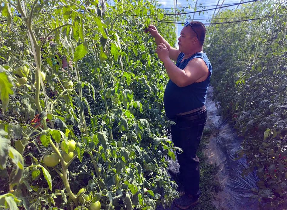 ▲裴玉兵在打理西紅柿秧苗