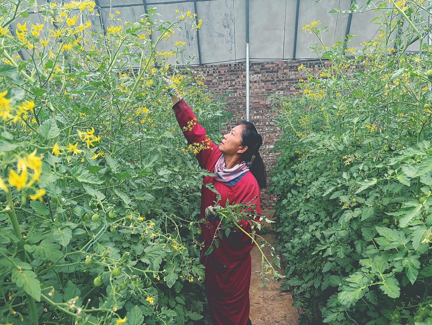 山河村大棚采摘園的工作人員正在給小番茄打杈。本報(bào)實(shí)習(xí)記者姚雅馨攝