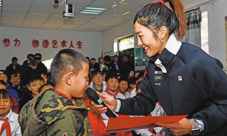 徐夢(mèng)桃(右)在內(nèi)蒙古阿爾山市白狼鎮(zhèn)白狼小學(xué)為當(dāng)?shù)匦W(xué)生普及滑雪知識(shí)(二〇一八年十二月攝)。新華社記者 劉 磊攝