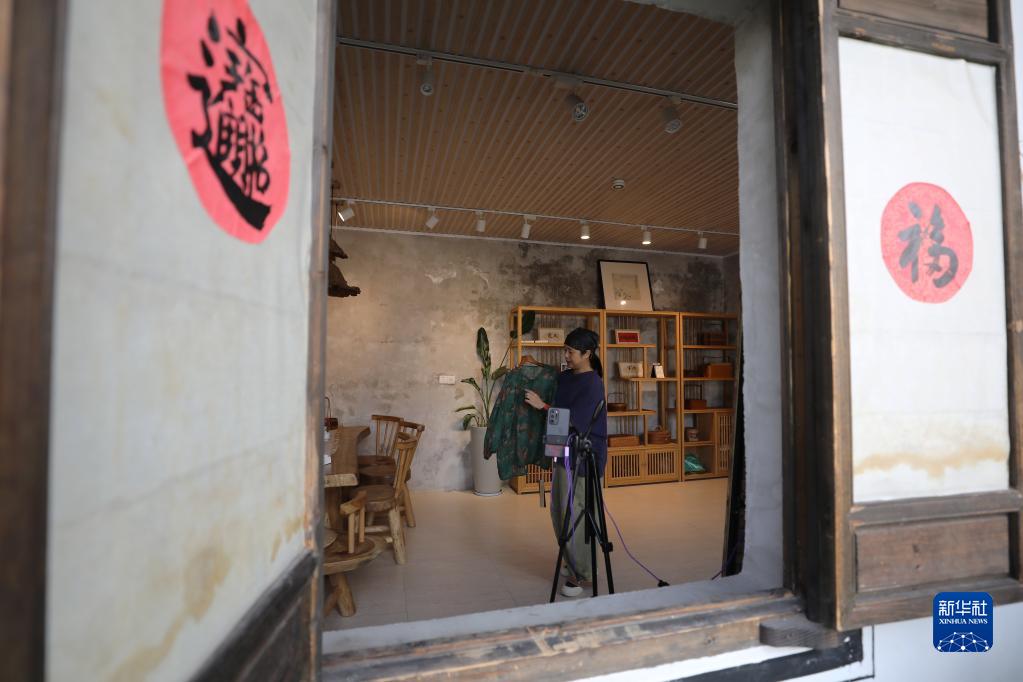 5月23日,在浙江省義烏市李祖村,創(chuàng)客鮑麗萍在店鋪里為網(wǎng)絡(luò)直播銷售做準備。