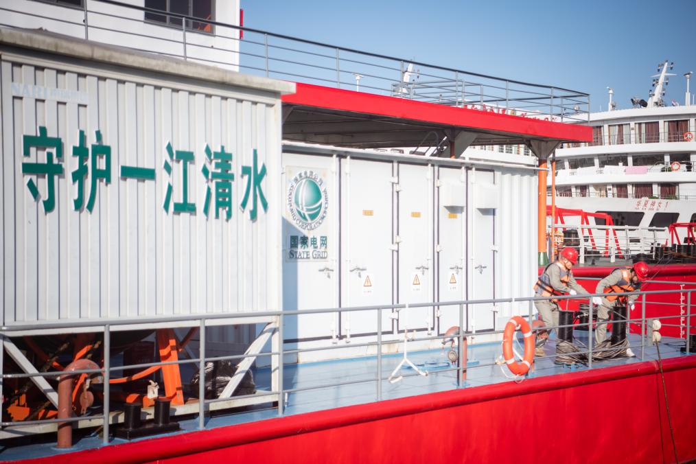 8月4日,國(guó)家電網(wǎng)宜昌供電公司岸電運(yùn)維人員在秭歸港供電躉船查看岸電系統(tǒng)專用接地線運(yùn)行狀態(tài)。新華社記者伍志尊 攝