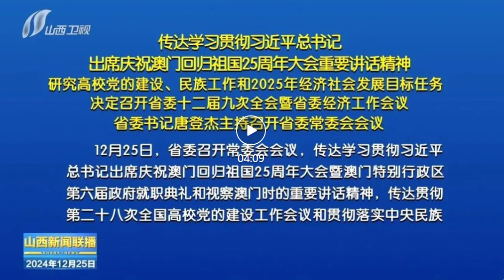 山西日報報道 12月25日,省委召開常委會會議,傳達學(xué)習(xí)貫徹習(xí)近平總書記出席慶祝澳門回歸祖國25周年大會暨澳門特別行政區(qū)第六屆政府就職典禮和視察澳門時的重要講話精神,傳達貫徹第二十八次全國高校黨的建設(shè)工作會議和貫徹落實中央民族工作會議精神經(jīng)驗交流會精神,研究2025年經(jīng)濟社會發(fā)展主要指標及財政收支計劃安排,決定于近日召開省委十二屆九次全會暨省委經(jīng)濟工作會議。省委書記唐登杰主持會議。