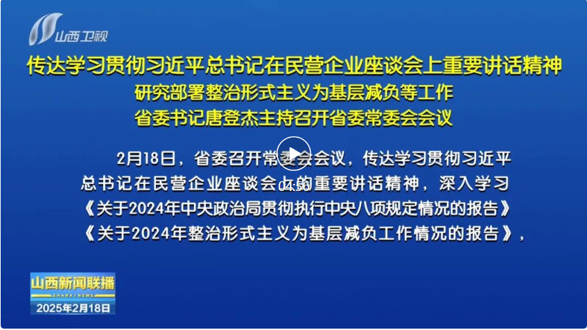 山西日報(bào)報(bào)道 2月18日,省委召開常委會會議,傳達(dá)學(xué)習(xí)貫徹習(xí)近平總書記在民營企業(yè)座談會上的重要講話精神,深入學(xué)習(xí)《關(guān)于2024年中央政治局貫徹執(zhí)行中央八項(xiàng)規(guī)定情況的報(bào)告》《關(guān)于2024年整治形式主義為基層減負(fù)工作情況的報(bào)告》,傳達(dá)貫徹中央層面整治形式主義為基層減負(fù)專項(xiàng)工作機(jī)制會議精神,審議通過《關(guān)于進(jìn)一步深化農(nóng)村改革扎實(shí)推進(jìn)鄉(xiāng)村全面振興的實(shí)施意見》《山西省人大常委會2025年立法計(jì)劃》《政協(xié)山西省委員會2025年度協(xié)商計(jì)劃》《政協(xié)山西省委員會2025年度重點(diǎn)民主監(jiān)督計(jì)劃》。省委書記唐登杰主持會議。