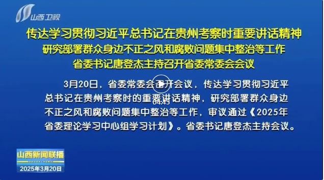 山西日?qǐng)?bào)報(bào)道 3月20日,省委常委會(huì)召開(kāi)會(huì)議,傳達(dá)學(xué)習(xí)貫徹習(xí)近平總書(shū)記在貴州考察時(shí)的重要講話精神,研究部署群眾身邊不正之風(fēng)和腐敗問(wèn)題集中整治等工作,審議通過(guò)《2025年省委理論學(xué)習(xí)中心組學(xué)習(xí)計(jì)劃》。省委書(shū)記唐登杰主持會(huì)議。