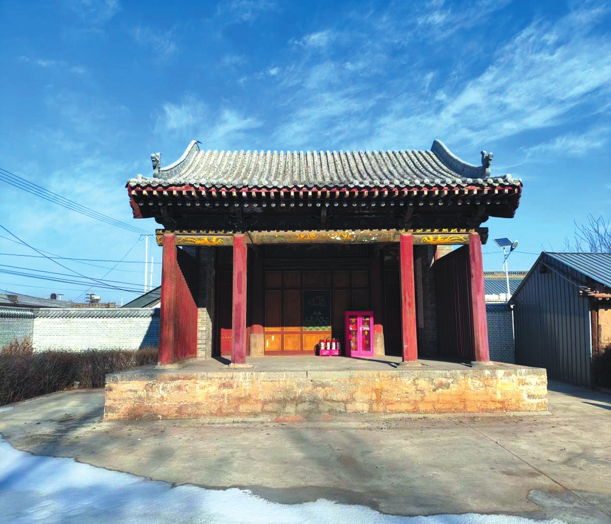 南街戲臺,又名火神廟古戲臺,位于五寨縣城南街南城門口、東七道街,是五寨縣重要的歷史文物遺存。南街戲臺創(chuàng)建于清道光三年(1823年),戲臺坐北朝南,面闊三間,總寬7.5米,樓高2.6米,硬山、博風(fēng)、卷棚式灰瓦布頂,斗拱獸頭為象首形。戲臺進(jìn)深四椽,前后臺之間設(shè)有隔斷,隔斷上鑲嵌牌匾,上款題“道光癸未”,匾刻“歌且舞”,落款為賈起蛟題。出將、入相轅門上額及墻壁檐柱均有精美彩繪圖案。
