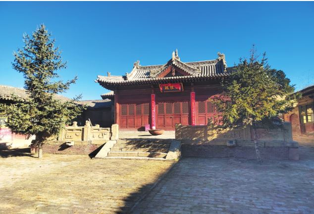 一進院布局,中軸線現(xiàn)存有正殿1棟,兩側建有配殿,西北角建有偏殿。正殿磚砌臺基,面寬五間,進深六椽,七檁前后廊式構架,前檐斗拱為五踩,后檐為三踩斗拱,單檐懸山頂。前設月臺,建有抱廈三間,單檐歇山頂。現(xiàn)新塑像3尊,正殿梁架有彩繪。