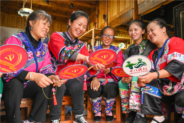 在湖南省湘西土家族苗族自治州花垣縣雙龍鎮(zhèn)十八洞村,村里的婦女在學習繡制“十八洞村”苗繡文創(chuàng)產(chǎn)品。郭立亮 攝