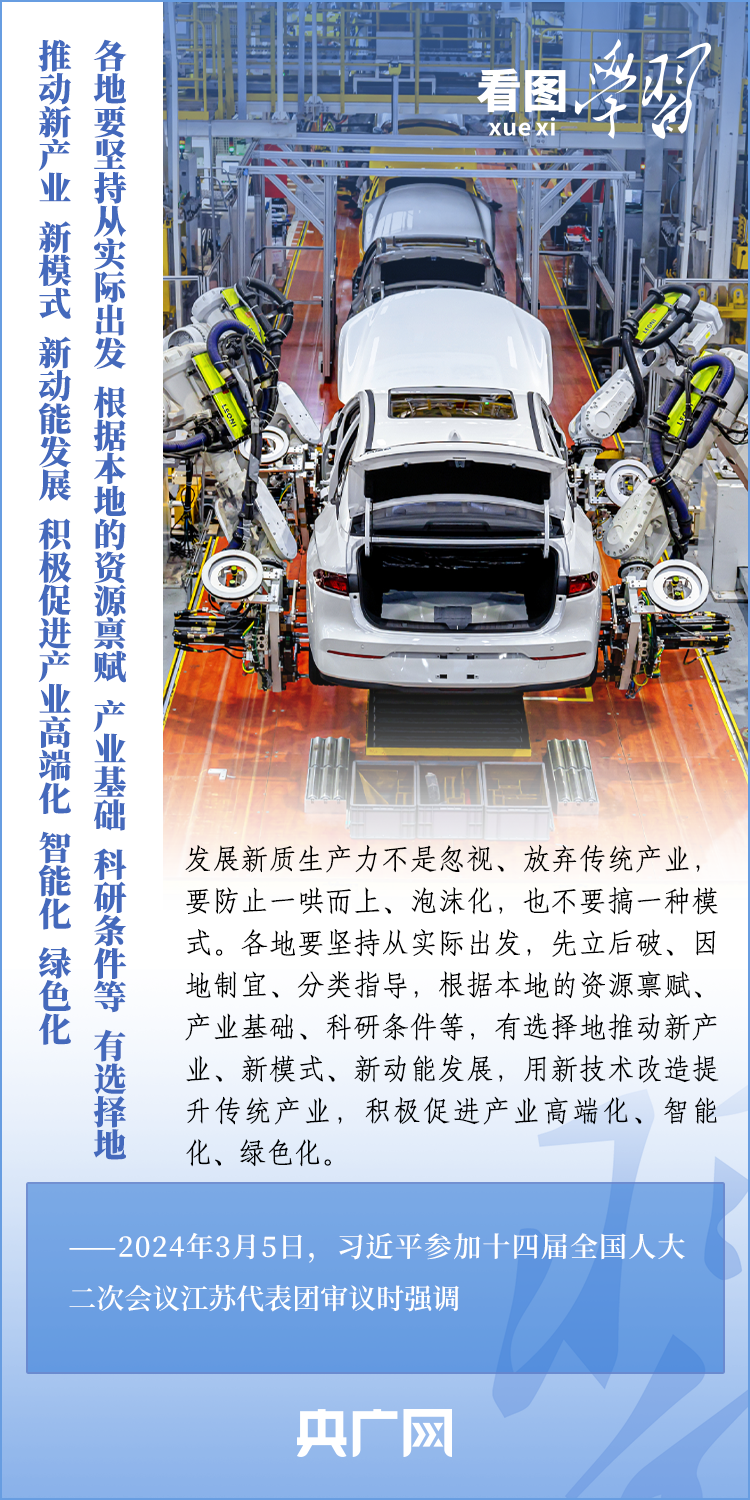 3月5日,十四屆全國人大二次會(huì)議正式開幕。5日下午,習(xí)近平總書記參加他所在的江蘇代表團(tuán)審議時(shí)強(qiáng)調(diào),要牢牢把握高質(zhì)量發(fā)展這個(gè)首要任務(wù),因地制宜發(fā)展新質(zhì)生產(chǎn)力。發(fā)展新質(zhì)生產(chǎn)力不是忽視、放棄傳統(tǒng)產(chǎn)業(yè),要防止一哄而上、泡沫化,也不要搞一種模式。一起來學(xué)習(xí)!