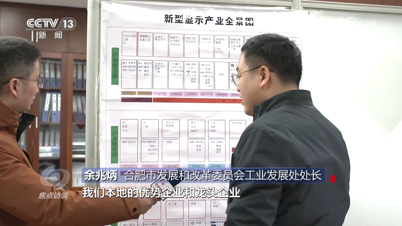 合肥市發(fā)展和改革委員會工業(yè)發(fā)展處處長余兆炳:“新型顯示產(chǎn)業(yè)全景圖上面顯示了合肥市發(fā)展新型顯示的產(chǎn)業(yè)鏈的上游、中游、下游本地的優(yōu)勢企業(yè)和龍頭企業(yè),有這個全景圖,我們對標(biāo)作戰(zhàn)、掛圖作戰(zhàn)非??梢暬鲬?zhàn)。”