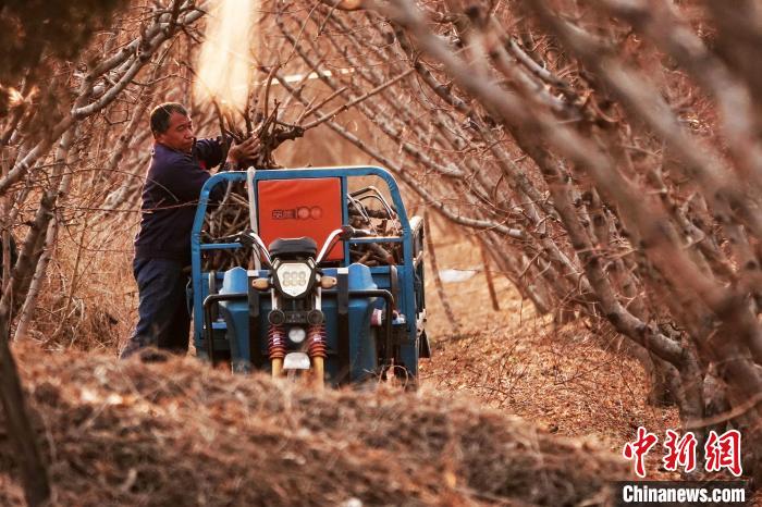 桃農(nóng)將修剪的樹枝裝車運(yùn)回。高新生 攝
