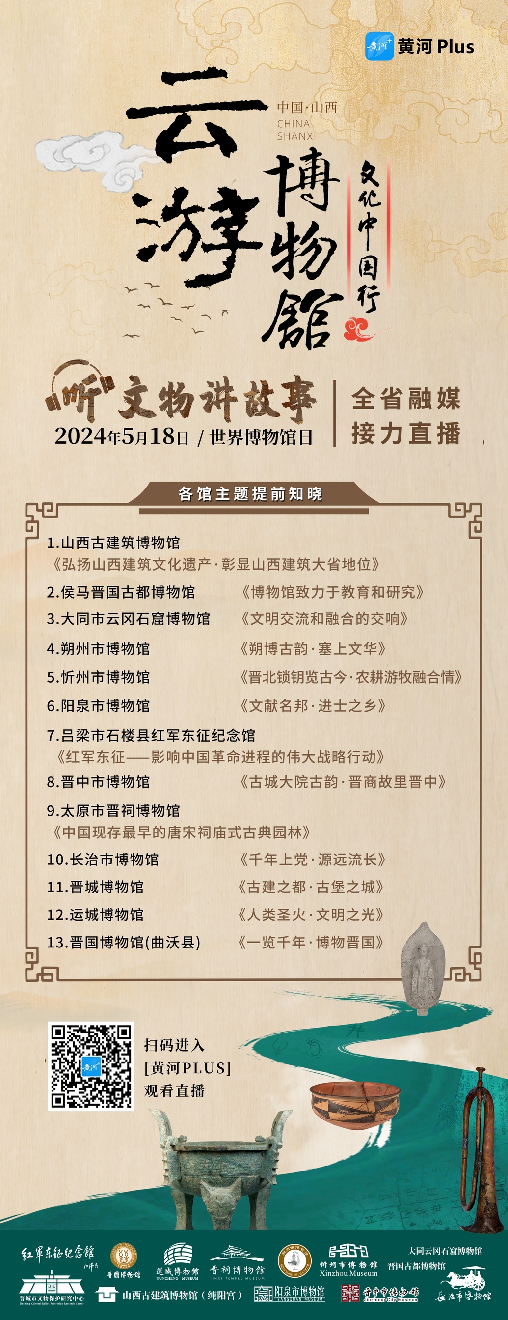 5月18日是世界博物館日,山西廣播電視臺視聽融媒體中心聯(lián)合全省11市廣電融媒體平臺,共同發(fā)起《云游博物館 聽文物講故事》全省融媒接力直播活動,邀請文物專家、學(xué)者、博物館工作人員,帶大家一起云游太原市晉祠博物館、運城博物館、大同市云岡石窟博物館、朔州市博物館、忻州市博物館、陽泉市博物館、晉中市博物館、長治市博物館、晉城博物館、侯馬晉國古都博物、晉國博物館(曲沃縣)、呂梁市石樓縣紅軍東征紀(jì)念館、山西古建筑博物館等13座特色博物館,圍繞13個博物館不同的主題,用線上直播的形式,講述藏品背后的文明密碼,助力公眾加深對博物館的了解,鑒賞山西豐富的館藏文物,感受中華文明中的山西貢獻。