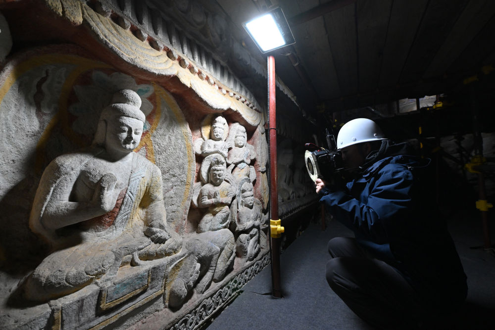云岡研究院數(shù)字化保護(hù)中心工作人員李敏在進(jìn)行影像采集(2024年2月27日攝)。