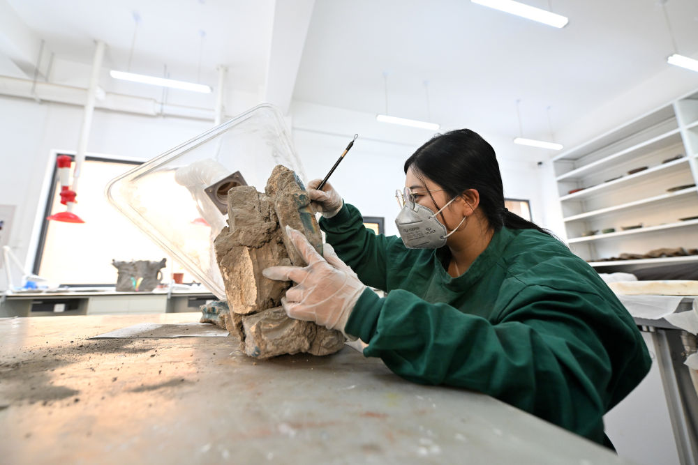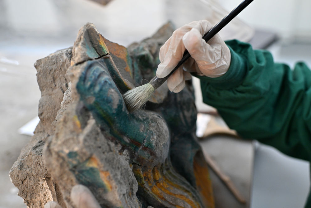 在云岡研究院可移動文物修復(fù)室,工作人員韓躍華在進(jìn)行除塵作業(yè)(2024年2月26日攝)。
