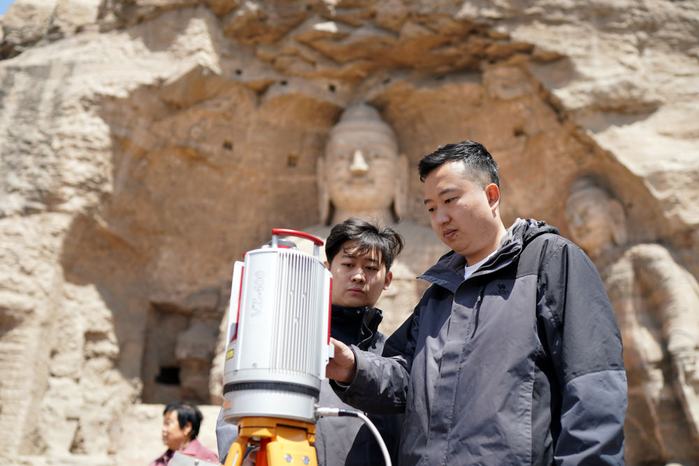 云岡研究院數(shù)字化保護(hù)中心工作人員在進(jìn)行數(shù)據(jù)采集(2021年5月8日攝)。