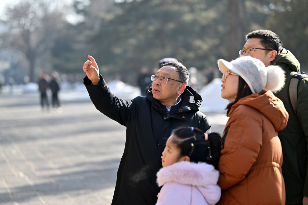 在山西大同云岡石窟,云岡研究院院長杭侃(右)在給游客講解石窟的歷史知識(2024年2月25日攝)。