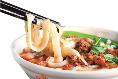 在開始削面之前,非常重要的步驟就是和面和醒面。和面的面和水需要按照一定的比例,同時對水溫也有一定的要求,冬天要用熱水,夏天要用涼水,春秋要用溫水。和好面之后緊接著就是醒面,需要用濕布蓋住面團(tuán)醒20分鐘左右。如果說吃刀削面是飽了口福,那么看刀削面下鍋可稱之為飽了眼福。一只手托著放著面團(tuán)的案板,另一只手拿著削面刀,削面刀又分為片刀和勾刀,削面時,出力要平,用力要均,削出的面條中間厚兩邊薄,一葉連著一葉,在空中劃出一道道弧形白線,落入鍋中的面條好似一條條銀魚,隨著熱水的翻滾不斷舞動。有順口溜贊曰:“一葉落鍋一葉飄,一葉離面又出刀,銀魚落水翻白浪,柳葉乘風(fēng)下樹梢。”