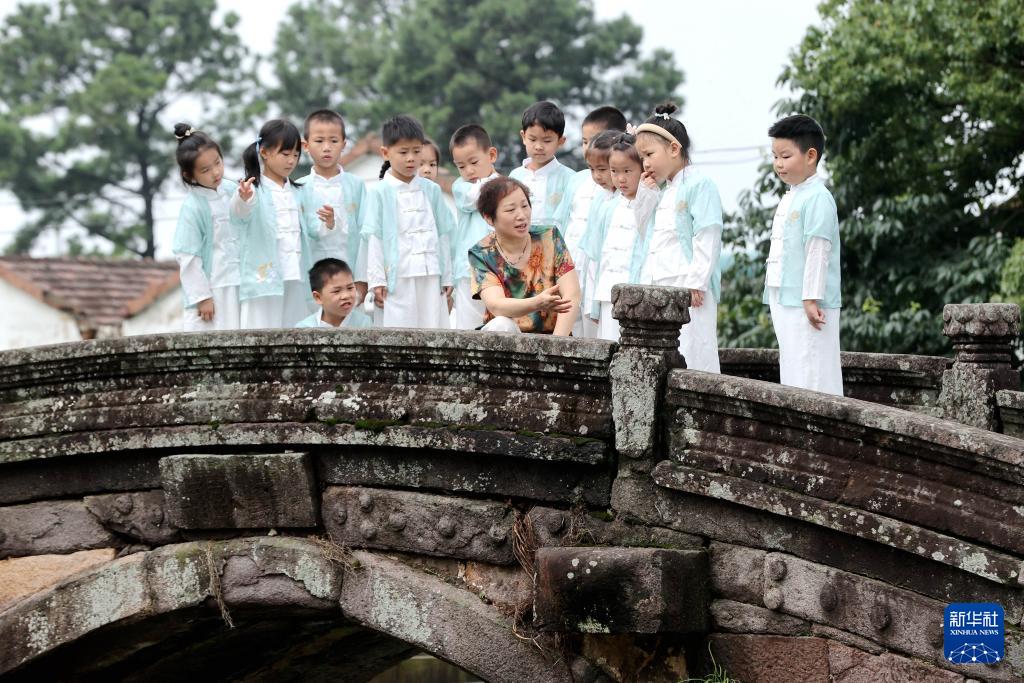 6月26日,在德清縣新安鎮(zhèn)舍北村,文化志愿者給孩子們講述萬(wàn)善橋的歷史知識(shí)。(新華社發(fā) 謝尚國(guó) 攝)