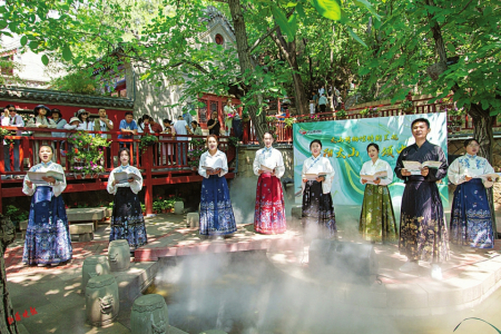 在太山景區(qū)售票廳里,背誦古詩(shī)詞免門票的活動(dòng)吸引了不少18周歲以下的學(xué)生參加,大家通過(guò)轉(zhuǎn)盤選定需要背誦的古詩(shī)詞,完成背誦即可獲得門票一張?!昂屯瑢W(xué)們正好一塊兒來(lái)了,通過(guò)參加這個(gè)活動(dòng),弘揚(yáng)我們的傳統(tǒng)文化,是非常有意義的?!苯衲晔钇?,太山景區(qū)面向廣大學(xué)生推出皮影戲、手工DIY印章、拓印等非遺體驗(yàn)活動(dòng)。同時(shí),景區(qū)還準(zhǔn)備了2000多套漢服,免費(fèi)為游客提供。