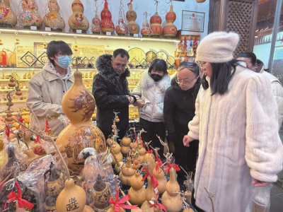 在吆喝聲此起彼伏的年貨市集,醒獅帽、剪紙、提燈等頗具年味的商品擺滿攤位,讓游客目不暇接,尤其是精美的葫蘆烙畫、面塑、扎染等非遺,既有傳統(tǒng)文化的風(fēng)韻,又融入現(xiàn)代設(shè)計巧思。
