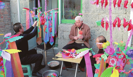 近些年,在制作炮燈的過程中,村民們還巧妙地融入了非遺剪紙藝術。精通剪紙藝術的村民在紅紙上揮舞剪刀,三下兩下就剪出福字、壽桃、蓮花等吉祥圖案,貼在炮燈上。“我從小學習剪紙,剪紙和炮燈結合在一起,傳承和弘揚了非遺,承載著我們對美好生活的向往和祝福。”正在剪紙的86歲村民翟蟬棠說道。