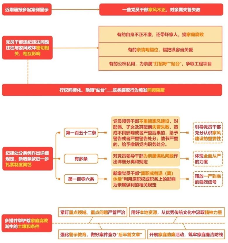 新修訂的《中國共產(chǎn)黨紀律處分條例》第一百五十二條對黨員領導干部“不重視家風建設,對配偶、子女及其配偶失管失教,造成不良影響或者嚴重后果”的情況作出規(guī)定,引導黨員干部充分認識家風建設的重要性。