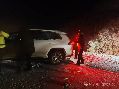 2024年11月25日晚18時(shí),繁峙縣公安局指揮中心接到廣東游客趙岸華的報(bào)警求助電話,聲稱其一行四人駕車從河北來五臺(tái)山旅游,行至太行一號(hào)旅游公路神堂堡繁五交界路段時(shí),因風(fēng)雪交加、道路結(jié)冰,車輛和人員被困。接到報(bào)警后,指揮中心立即通知神堂堡派出所和交警中隊(duì)前往救助。救援民警頂風(fēng)冒雪順著太行一號(hào)旅游公路沿路搜尋,經(jīng)過3個(gè)多小時(shí)的艱難跋涉,終于在神堂堡鄉(xiāng)盤道村往南約5華里的路上(已屬五臺(tái)山風(fēng)景區(qū)地界)找到了被困車輛。當(dāng)時(shí)該車燃油即將耗盡,車上四人凍得瑟瑟發(fā)抖,救援民警當(dāng)即將3名乘客轉(zhuǎn)移至警車上,并協(xié)助拖車司機(jī)將被困車輛連上拖車后原路折返,最終在11月26日凌晨2時(shí)將被困游客和車輛安全營救回派出所。