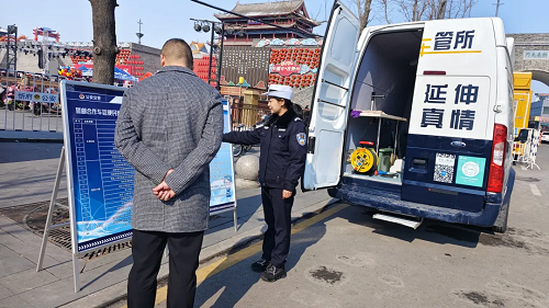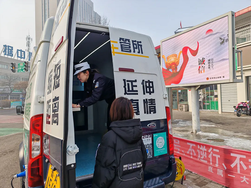春節(jié)假期,城市、鄉(xiāng)村到處都彌漫著歡樂祥和的氣氛,初一至初七,在山西省忻州市忻府區(qū)光明西街古城北廣場、公園西街世紀(jì)花苑小區(qū)南門等人流量大、人員集中場所,忻州市公安局交警支隊(duì)的警郵車管便民服務(wù)車格外顯眼?!翱s短距離、延伸真情”,這輛承載著為駕駛?cè)颂峁崆橹艿椒?wù)、為車輛安全出行提供保障,被群眾稱為“流動(dòng)車管所”的車管便民服務(wù)車讓寒冬暖流涌動(dòng)。
