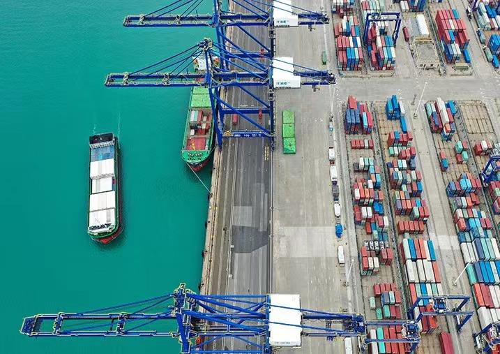 △集裝箱貨輪在海南洋浦國(guó)際集裝箱碼頭裝卸貨物。