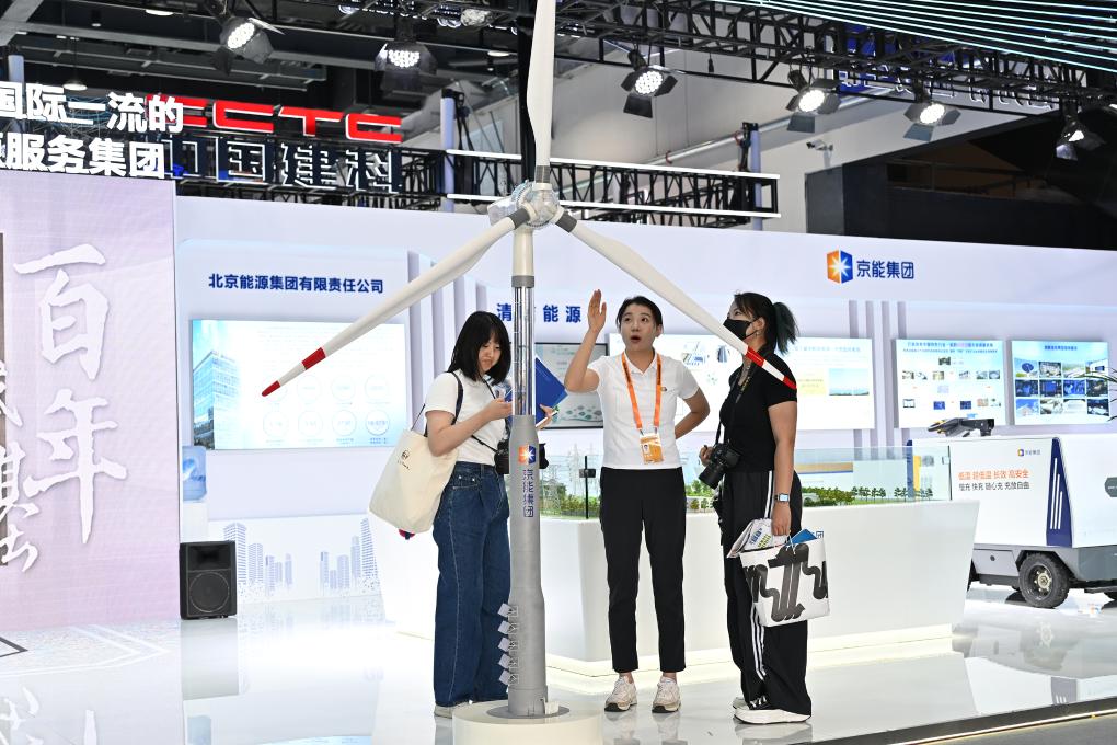 參觀(guān)者在服貿(mào)會(huì)首鋼園區(qū)京能集團(tuán)展臺(tái)觀(guān)看一款新型風(fēng)機(jī)模型。新華社記者 李鑫 攝