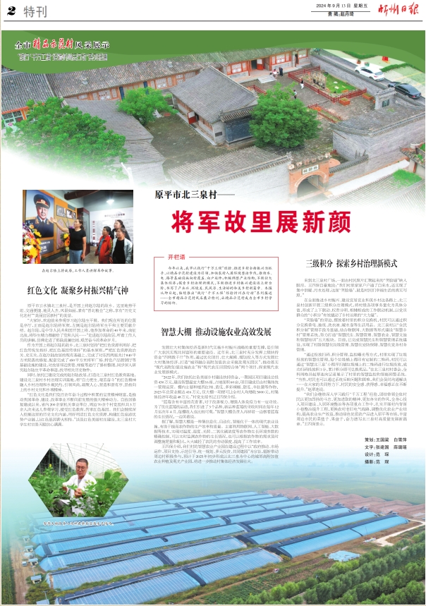 今年以來,我市以踐行“千萬工程”經(jīng)驗、推進(jìn)鄉(xiāng)村全面振興為抓手,以精品示范村建設(shè)為引領(lǐng),加快農(nóng)村人居環(huán)境整治步伐,推動水、電、路等基礎(chǔ)設(shè)施向村覆蓋、向戶延伸;積極調(diào)整產(chǎn)業(yè)結(jié)構(gòu),不斷壯大集體經(jīng)濟(jì);探索鄉(xiāng)村治理新模式,不斷推進(jìn)鄉(xiāng)村振興建設(shè)邁上新臺階,書寫了產(chǎn)業(yè)興、環(huán)境美、民風(fēng)淳、生活好的和美鄉(xiāng)村新篇章。本報從即日起,陸續(xù)推出“踐行‘千萬工程’經(jīng)驗忻州在行動”系列報道——全市精品示范村風(fēng)采展示特刊,讓精品示范村成為全市鄉(xiāng)村學(xué)習(xí)的標(biāo)桿。