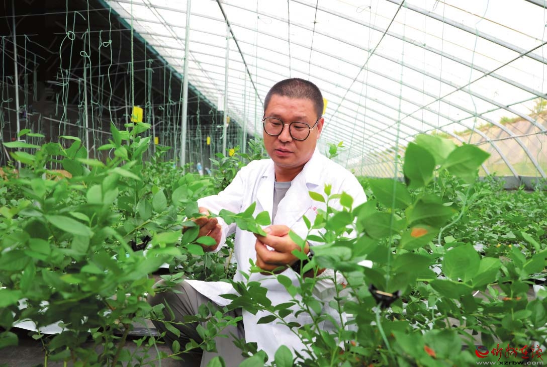 智慧大棚負(fù)責(zé)人馮祥君察看藍(lán)莓生長情況。