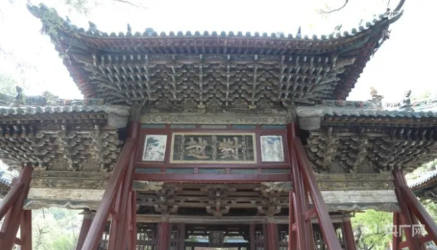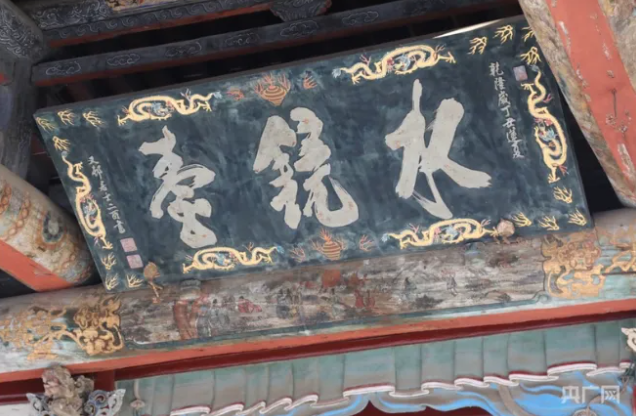 水鏡臺(tái)是一座古戲臺(tái)(央廣網(wǎng)記者 郎麒 攝) “對越”匾。對越坊懸掛匾額“對越”?!皩υ健倍殖鲎浴对娊?jīng)》中“對越在天,駿奔走在廟”“對”為報(bào)答,“越”為宣揚(yáng),意為報(bào)答宣揚(yáng)祖先的高尚功德?!皩υ健必蚁鄠饔商h舉人、書法家高應(yīng)元所書,“對越”二字為榜書金字,筆力遒勁,氣勢磅礴,宛如山岳嵯峨,棱角俏麗。