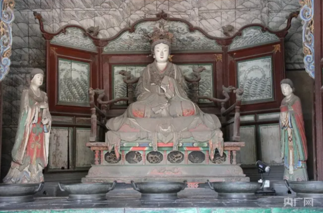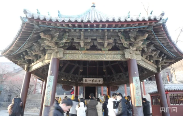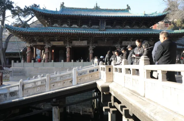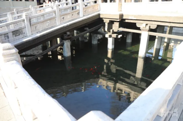 圣母殿(央廣網(wǎng)記者 郎麒 攝) 中國最早的水陸立交橋——魚沼飛梁。魚沼飛梁西依圣母殿,東鄰獻(xiàn)殿,初建在北魏之前。飛梁的形式古樸,橫跨于魚沼之上,借以觀賞景物,南北東西四面伸長,如鳥之振翼欲飛狀,是中國少有的一種十字橋梁形式,被譽(yù)為中國最早的水陸立交橋。